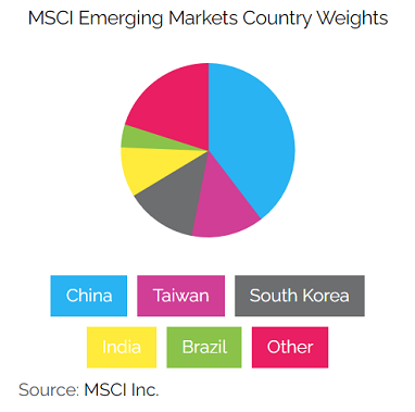 First, the low-hanging fruit. The MSCI Emerging Markets (EM) Index is used to measure the stock market performance within emerging economies. The Index was launched in 1988 including 10 countries with a weight of about 0.9% in the MSCI ACWI Index. Currently, it captures 26 countries and has a weight of 12% in the MSCI ACWI Index, with more than 1,300 large- and mid-cap securities. Many ETFs, such as Blackrock’s iShares MSCI Emerging Markets ETF, track this index.