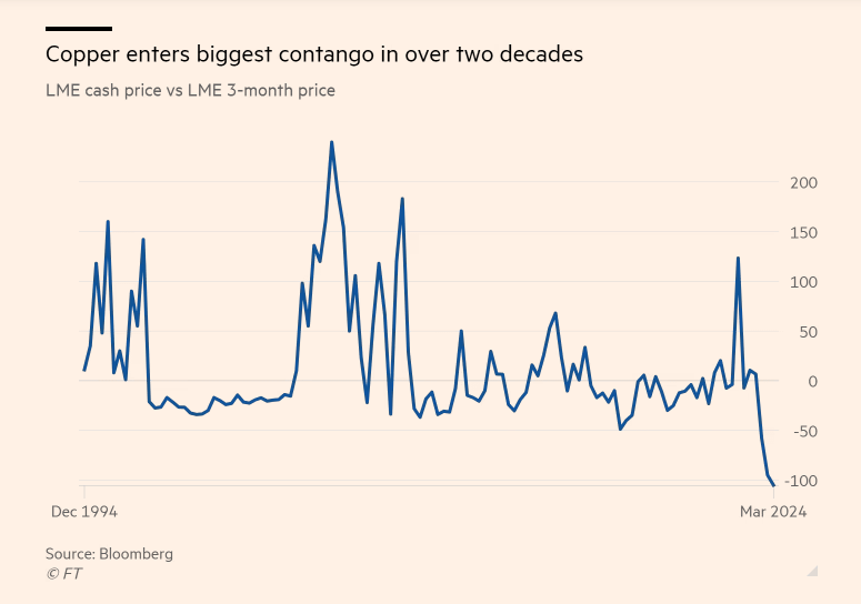 Future copper prices are getting higher than spot, bringing the biggest contango in over 20 years.