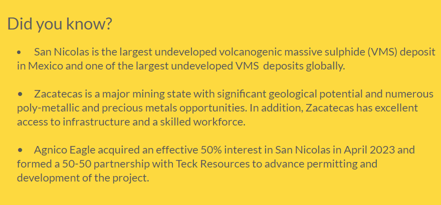They closed a JV with Teck, where they’ll fund $580MM of the capex of San Nicolas, a VMS copper/zinc deposit in Mexico.