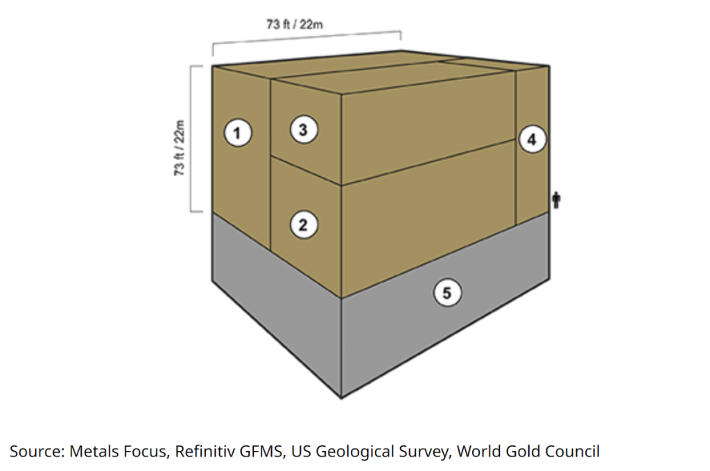 If we consider all production throughout history, it would neatly fit in a cube, 22m per side.