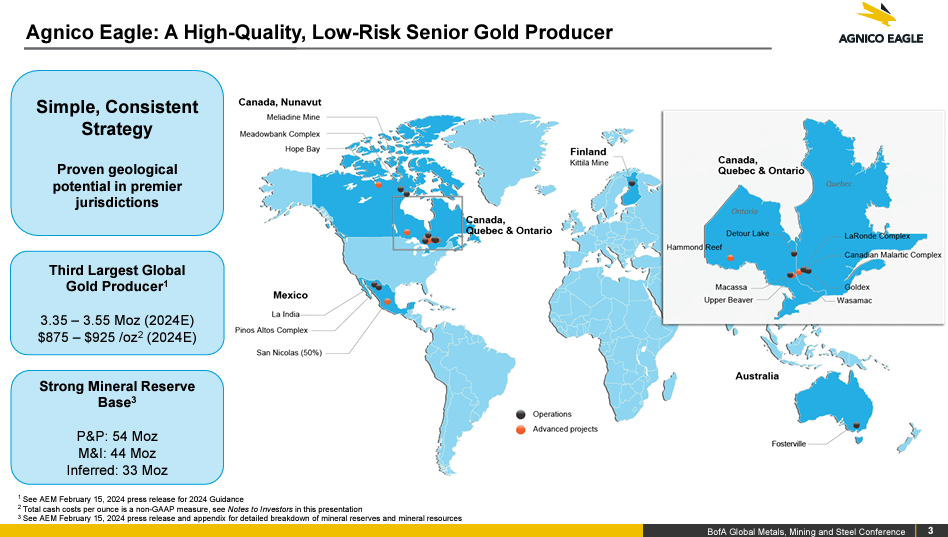 Agnico is the 3rd largest gold producer with 106.8t and has a strong mineral reserve base.