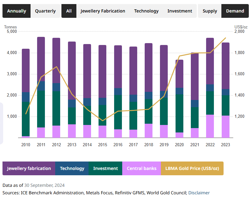 • In Q3 2024, total gold supply grew by 5% year-on-year.