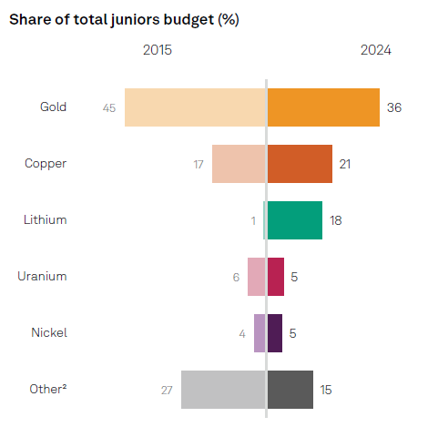 Among juniors, comparing 2015 to 2024, there’s been a migration from gold to lithium, copper and other minerals. Majors remained stable.