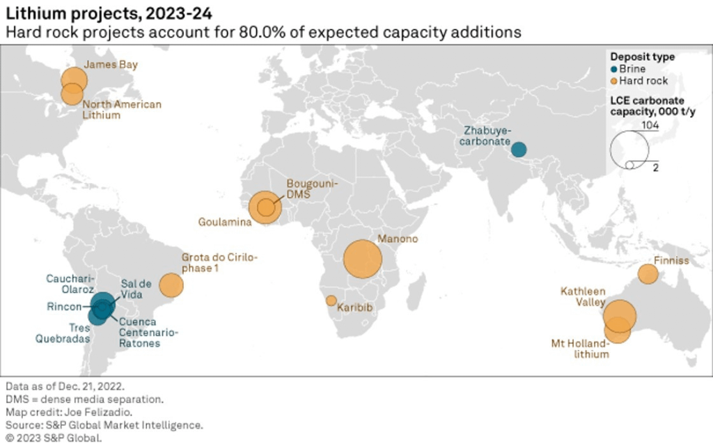 This lithium comes exclusively from hard rock mines, which are traditional mining operations, in minerals such as spodumene. Brine deposits are common in the Lithium Triangle.