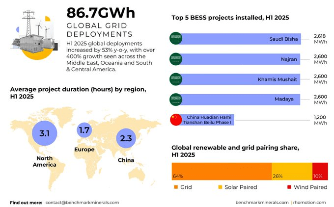 BESS projects are on the rise, further fueling lithium forecasts. Global deployments increased 53% YOY in the first semester with massive growth across Asia and South/Central America. This is just getting started…