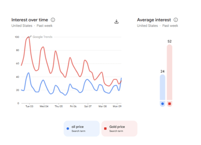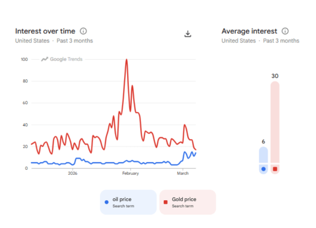 But when we zoom in on the last week after the Iran conflict exploded, there is an inflection point. In fact, searches for “oil price” have surpassed “gold price”.